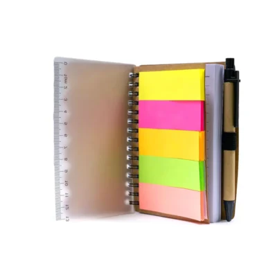 Compact and practical, this A6 craft notebook includes a scale, a pen, and colorful Post-it notes, perfect for jotting down notes and staying organized on the go.